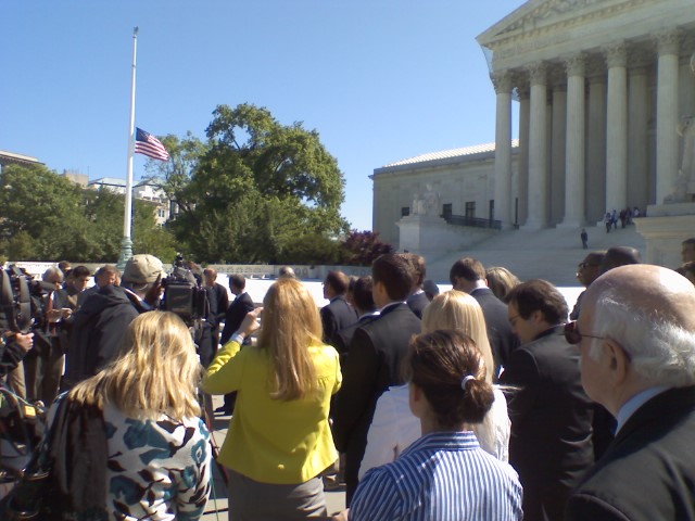 Usually, members of Congress do their Supreme Court bashing from the safety of the Senate or House floor. Today, they entered enemy territory by having a press conference out in front of the court itself. The not-so-subtle symbolism marked the unveiling of legislation aimed at curbing the impact of the FEC v. Citizens United campaign finance ruling. The Democratic senators, led by Charles E. Schumer of New York and Russ Feingold of Wisconsin, said their aim wasn’t to demonize the court’s conservative majority but they couldn’t resist a few digs. Feingold claimed the court didn’t “have the nerve” to strike down the McCain-Feingold campaign finance bill in its entirety. Schumer warned that the five justices in the Citizens United majority have to be he held accountable, although he admitted there wasn’t really a way to do that. Making the most of the beautiful weather in Washington, Schumer noted in reference to the court behind him that “the beauty of this building can’t even be debased by the ugliness of the ruling in Citizens United.”