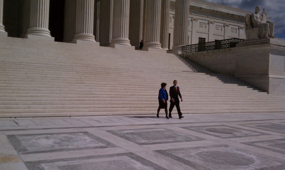 Justice Elena Kagan is escorted down the Supreme Court's front steps by Chief Justice John G. Roberts Jr. after today's investiture ceremony.