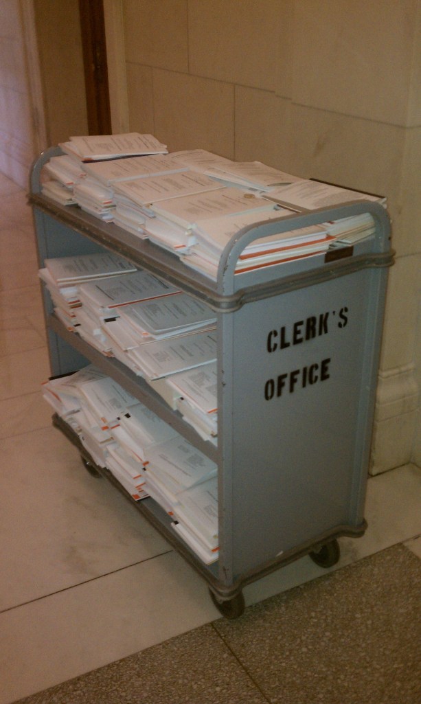 Your blogger helped discard the Reuters copies of the SCOTUS petitions that piled up over the summer and were rejected by the court this morning, the court’s first day back in session. Before carting them to the clerk’s office, he took this photo to illustrate the amount of paperwork involved. These are just the paid petitions. Think of all those billable hours….